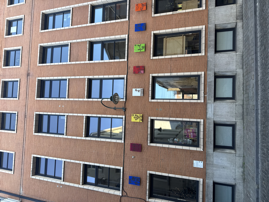 A five-story building with a reddish-brown brick facade is observed in Brussels, Belgium, specifically near Nieuwland (Terre-Neuve street), as indicated by an interior sign visible through a window