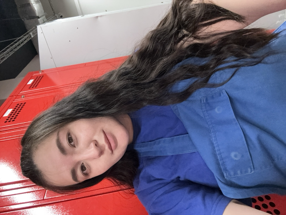An individual with long, wavy, dark brown hair and a fair complexion is depicted in a close-up, chest-up shot, looking directly at the camera with a neutral expression. She is wearing a royal blue short-sleeved t-shirt and dark blue overalls, which feature a large chest pocket with two distinct, faint circular marks on its surface. The background on the left consists of a series of bright red metal lockers, equipped with horizontal ventilation slats and silver handles. To the right, a light gray or white partition wall is visible, showing visible fasteners and a minor indentation. Overhead, industrial ceiling elements, including a dark grid structure and light-colored ductwork, are present. The scene is brightly lit, indicative of an indoor utility or changing room environment within Sof'ino, Russia.