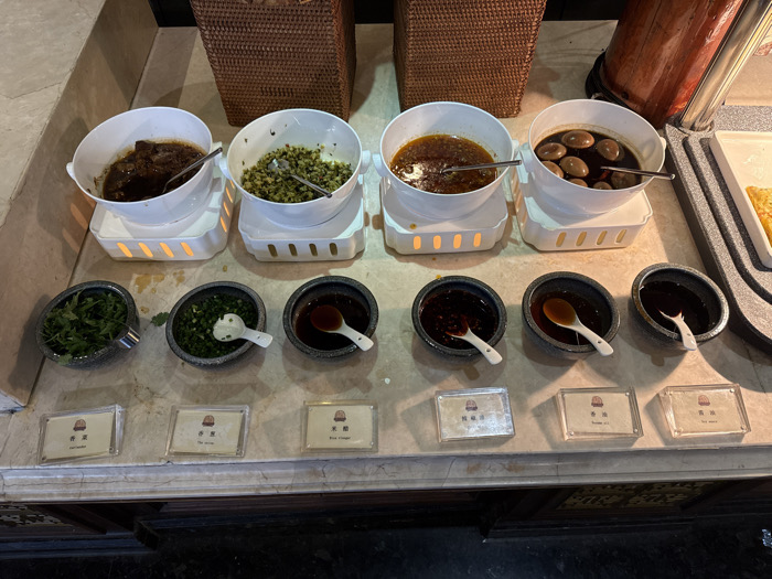 An indoor culinary display counter is depicted in Tongxiang, China, presenting various Chinese food items and condiments