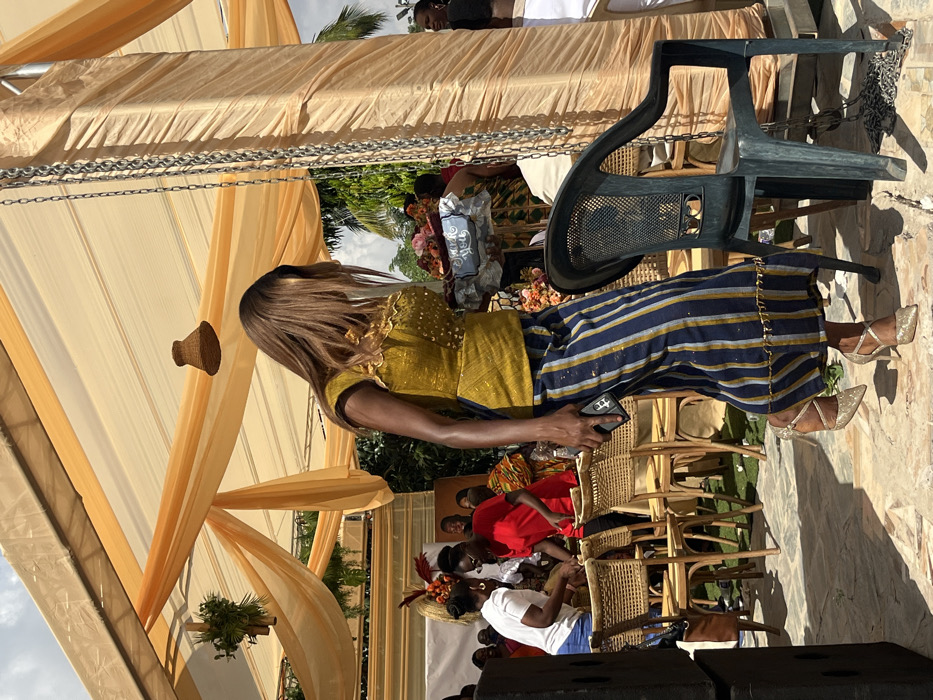 An outdoor gathering is depicted in Kumasi, Ghana, beneath a large canopy constructed from translucent golden-yellow fabric