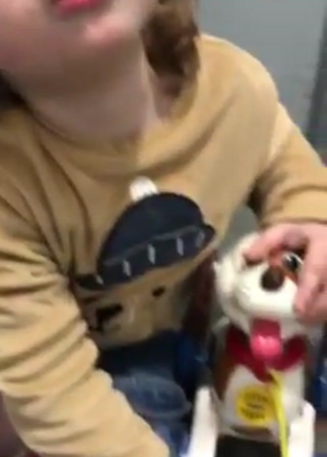 A young child with light brown hair and wearing a yellow, long-sleeved shirt is shown in a close-up shot. The child looks directly at the camera and puckers their lips as if making a kissing motion. The camera then pans down to show the child sitting on the floor with a toy dog. The toy dog is white and brown, with a red collar and a yellow pull string. The child is holding the toy dog and appears to be inspecting it. The background is a plain, gray wall and carpeted floor.