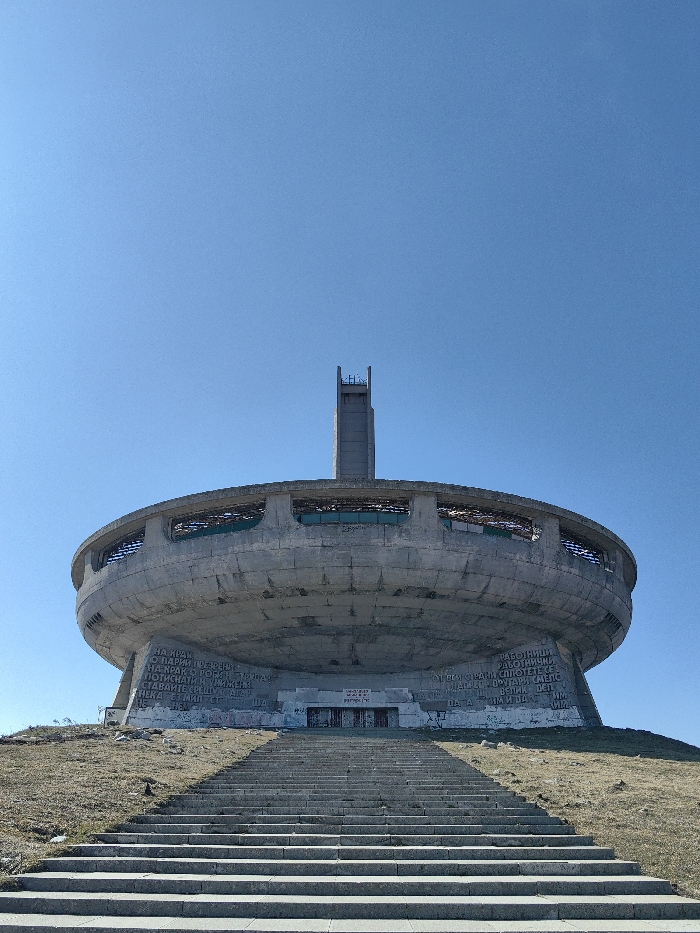 - "The image presents the Buzludzha Monument located on Buzludzha Peak, near the city of Shipka, Bulgaria, under a clear blue sky" by FM-tqeth1, licensed under CC BY 4.0