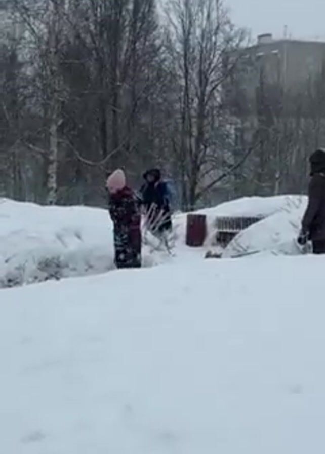 A video shows three individuals outdoors on a snowy day