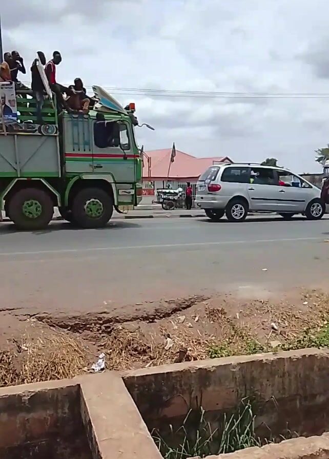 street scene in what appears to be a developing country. A large green truck passes the camera, filled with many people sitting and standing on the bed. Next to the truck, a silver minivan drives in the opposite direction. In front of the truck and van, a red motorcycle rides along the same road. The road surface is cracked and partially broken. On the side of the road, there is a concrete drainage ditch, filled with dry grass and debris. The sky is overcast. In the background, there are various buildings, including a structure with a red roof. A street lamp stands tall on the side of the road. The overall impression is one of a busy, somewhat rundown environment.