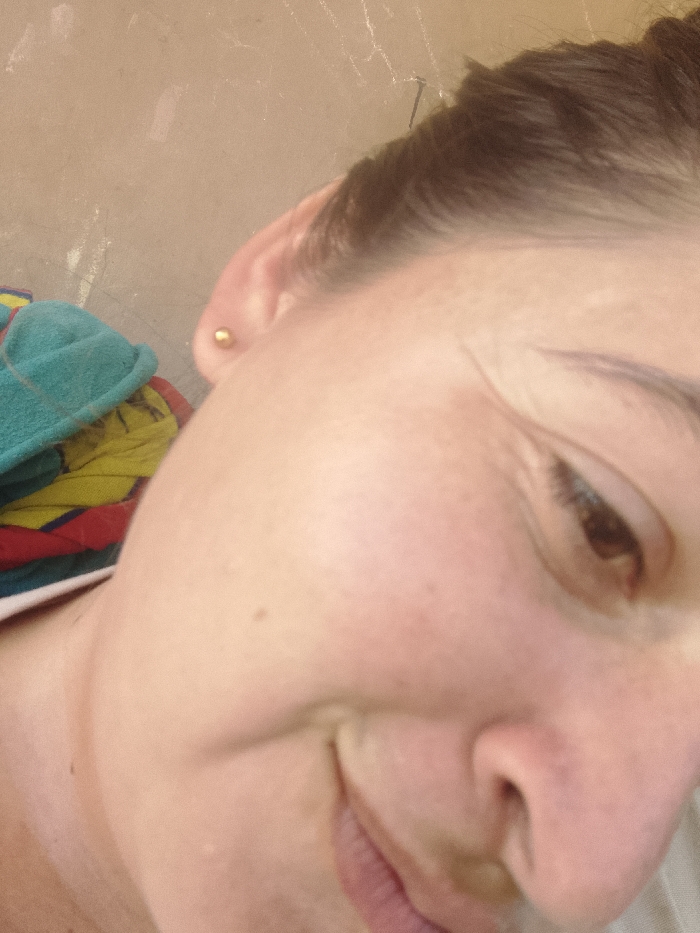 The image displays a close-up, angled indoor shot focusing on a portion of an individual's face and upper body. The location in Altagracia, Venezuela, cannot be determined from the visual evidence. The central subject is an adult individual with fair skin. The right side of their face is prominently featured, angled downwards and slightly to the left of the frame. Their dark hair is pulled back, revealing the right ear, which has a small, round, gold-colored stud earring on the lobe. The right eye is partially visible, looking downwards, with dark eyelashes and a dark eyebrow. A natural crease is present on the right cheek, along with a small mole or blemish. The lower-left portion of the frame shows the individual's mouth, exhibiting a slight upward curve indicative of a smirk or gentle smile. A portion of the neck and a white collar are visible on the left edge. The background consists primarily of a light brown or tan wall or vertical surface, which appears somewhat textured or imperfect. In the upper-left background, a stack of folded textiles is present, with a teal or turquoise-colored item on top, layered over patterned fabrics displaying red, yellow, and blue colors. Lighting is ambient and diffused. No specific actions beyond the facial expression are discernible.
