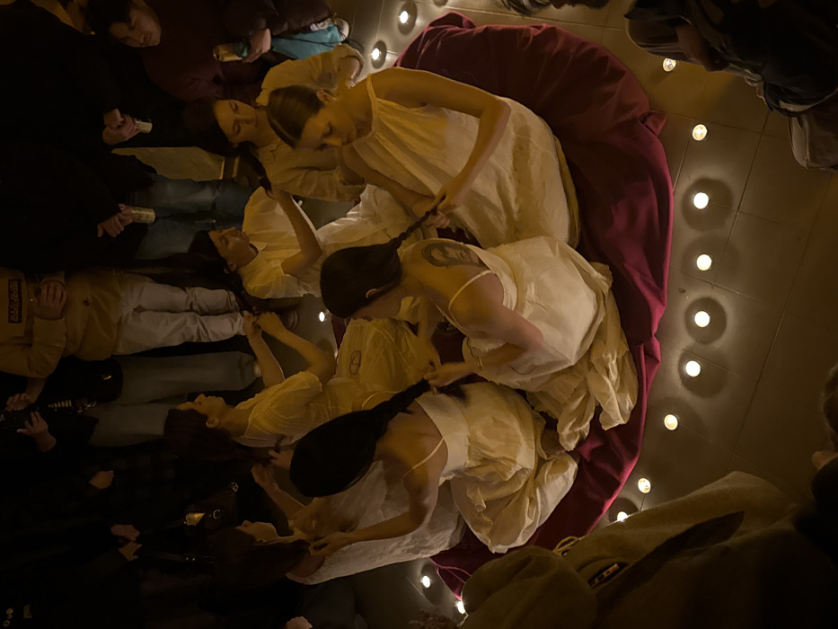 An overhead photograph captures an art performance or ritual occurring indoors at KO-OP, ul