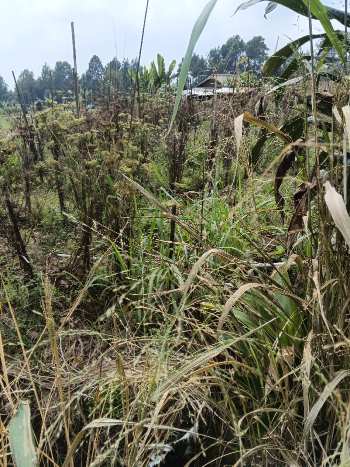 A static, eye-level photograph taken in Mong Pun Teing, Myanmar, captures an outdoor scene dominated by dense, mixed vegetation. The immediate foreground is filled with various types of grasses and broad-leaf plants, presenting a mix of dry, light-brown, and green foliage, some bearing visible seed heads. In the midground, a field of uniformly tall, dried-out plants with distinctive umbrella-shaped or clustered seed heads is prominent. Beyond this field, greener trees, including identifiable banana plants, are visible. In the background, a light-colored structure with a dark roof is partially discernable amidst a distant line of evergreen trees. The sky above is overcast. No human subjects, animals, or observable actions/interactions are present within the frame.
