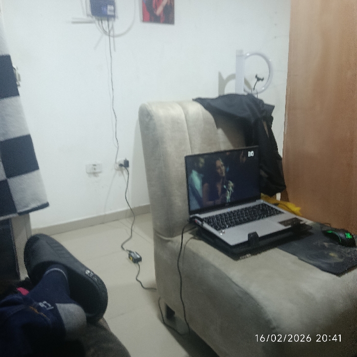A cozy room is seen with a cream-colored chaise lounge as the focal point. A laptop rests on it, displaying a movie scene. A black jacket is draped over the lounge's back. A black mouse pad and green gaming mouse are beside the laptop. On the left side, a person with slippers and socks is relaxing. The room's decor is simple, with a white wall and a few electrical outlets. A picture frame and a ring light are visible on the wall.