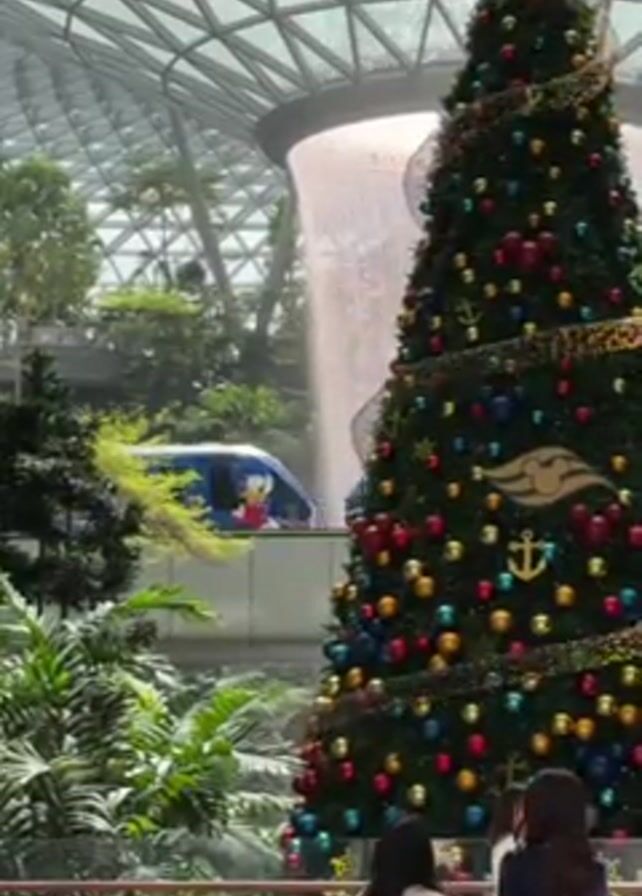 - "large, decorated Christmas tree with a star on top, inside a building with a waterfall" by FM-1neqH3, licensed under CC BY 4.0