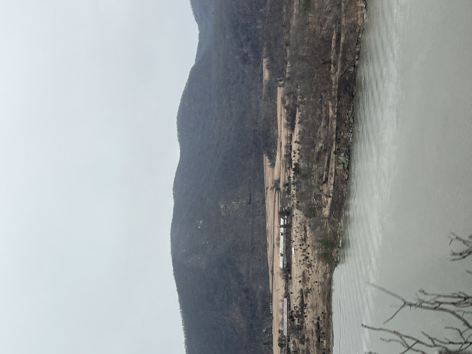 The image depicts an expansive, somber landscape overlooking the Hudson River in the Town of Cortlandt, United States of America, under an overcast sky. In the immediate foreground, out-of-focus, bare tree branches partially obscure the view from an elevated vantage point. A wide, gray body of water, indicative of the Hudson River, occupies the lower third of the frame, its surface textured by distinct, parallel ripples. Across the water, the rocky, irregular shoreline is visible, sparsely dotted with leafless trees and shrubs. A narrow, dark linear feature, possibly a path or railway track, runs parallel to the water's edge. Beyond this, the mid-ground consists of a broad, relatively flat plain covered in dry, light brown, dormant vegetation, interspersed with small, barren trees. Within this plain, two distinct building complexes are visible. To the left, a cluster of buildings features red roofs. To the right, a longer, multi-sectioned building with a darker roof and visible windows suggests an institutional or industrial structure. The background is dominated by a range of steep, tree-covered mountains or large hills, appearing dark and largely devoid of foliage, confirming a late autumn or winter setting. Patches of lighter color on the slopes may indicate exposed rock or sparse snow. A subtle horizontal line, possibly a road or railway, can be discerned traversing the lower section of the mountain. No individuals, explicit actions, or interactions are discernible within the frame. The overall light is diffused and gray, consistent with an overcast day.