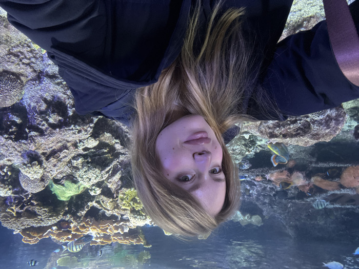 The image displays a female subject positioned for a selfie in front of a marine aquarium exhibit