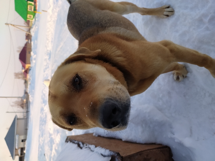 - "A medium-sized dog, primarily light brown with darker tan fur visible on its back and ears, stands in a snow-covered outdoor setting in Kuyeda, Russia" by FM-k5zVp2, licensed under CC BY 4.0