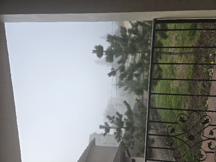 The image presents an outdoor scene observed from an elevated perspective, framed by a light-colored overhead structure and a vertical pillar on the right. A black wrought-iron railing with ornate scrollwork, including heart-shaped motifs in the lower-left section, occupies the bottom portion of the frame. Immediately beneath the railing, a narrow paved strip borders a ground area containing sparse green grass and small purple and yellow flowering plants. Beyond the railing, a partially maintained lawn or garden area features green grass interspersed with patches of exposed soil. Several coniferous trees with green needles are positioned across this midground; two prominent trees are visible, one situated slightly left of center and another to the right. To the left, a portion of a building with a reddish-brown tile roof and a light-colored, possibly stone-clad wall is visible. Utility lines or wires are faintly discernible traversing horizontally across the upper midground. The entire background and sky are enveloped in a dense, uniform grey fog, severely limiting visibility. Distant architectural elements and vegetation are reduced to indistinct, shadowy forms. No individuals, animals, or discernible activities are present in the scene. The location is Knezha, Bulgaria.