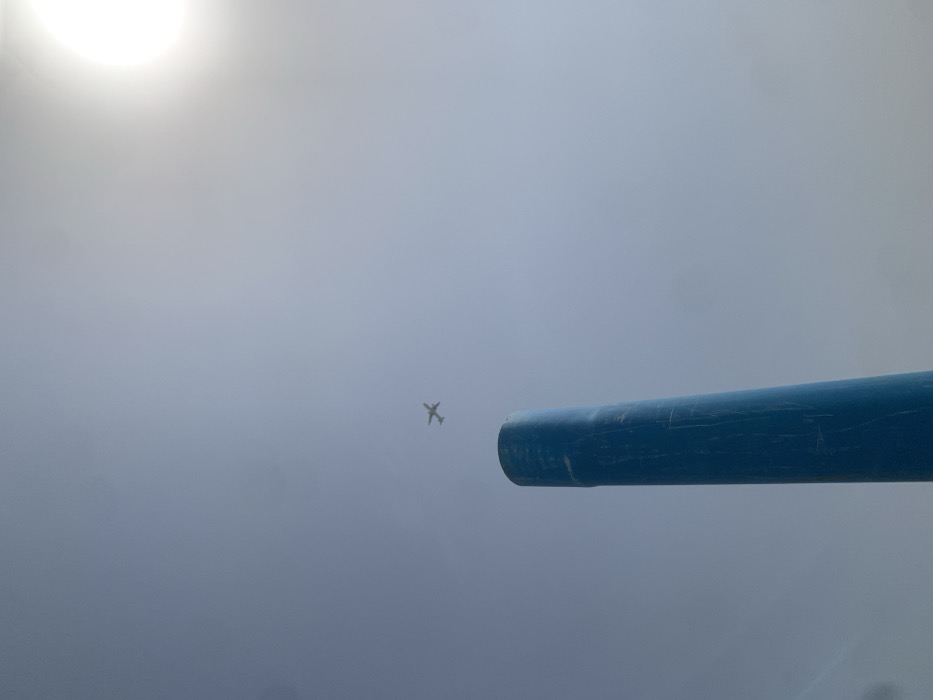 In Karsana 2, Nigeria, a low-angle vertical photograph captures a weathered, blue cylindrical pole or pipe in the lower and central-left foreground, extending upwards from the bottom edge. Its surface exhibits multiple light-colored streaks and scuff marks. The background consists of a hazy, light blue sky with a bright, glaring sun positioned in the upper right quadrant. A small, light-colored aircraft, identified as an airplane, is visible in the upper-left sky, flying above and to the left of the blue structure. No people or other objects are discernible.