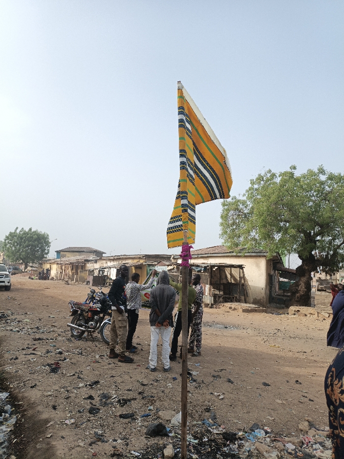 A group of five people are standing in a street, with a motorcycle parked nearby. The street appears to be littered with trash and debris, with simple buildings lining the background. A tall pole with a yellow and white striped flag stands prominently in the foreground. A large tree is visible on the right side, and a car is partially visible on the left. The sky is overcast and bright.