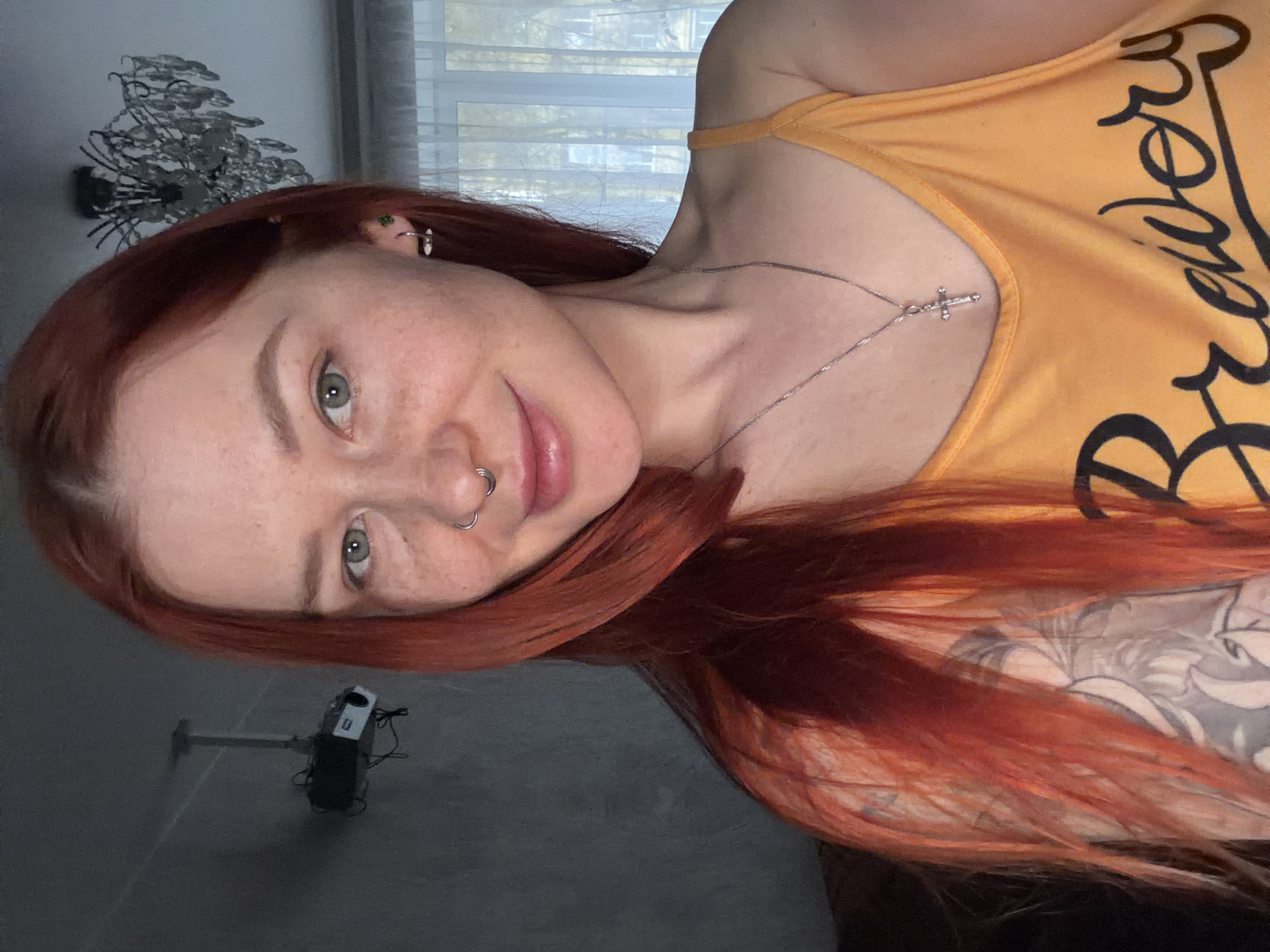 A woman with red hair and fair skin is angled to the right in the frame. She has visible freckles and piercings in her nose and ears. She is wearing a yellow tank top with the word "Brewery" written on it. A silver necklace with a cross pendant hangs around her neck. A tattoo is visible on her shoulder and arm. The background includes a window with sheer curtains, a decorative light fixture on the wall, and a gray wall. In the bottom left corner of the image, there's a small black object mounted on a gray pole on a gray floor. There is no definitive evidence to ascertain the location is in Rostov-on-Don, Russia.