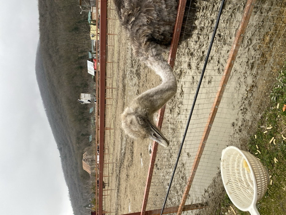 The scene is an outdoor ostrich enclosure in Терновский округ, Ukraine, under an overcast sky