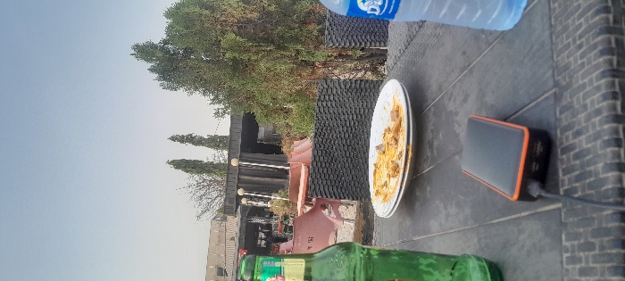 On a gray wicker table, a partially eaten plate of pasta sits next to a small, black and orange electronic device connected by a cable. A green glass bottle rests near the table's edge, while a blue plastic water bottle is positioned towards the top. In the background, trees and a partly visible building are seen, suggesting an outdoor setting under a clear sky. The scene evokes a casual, leisurely atmosphere.