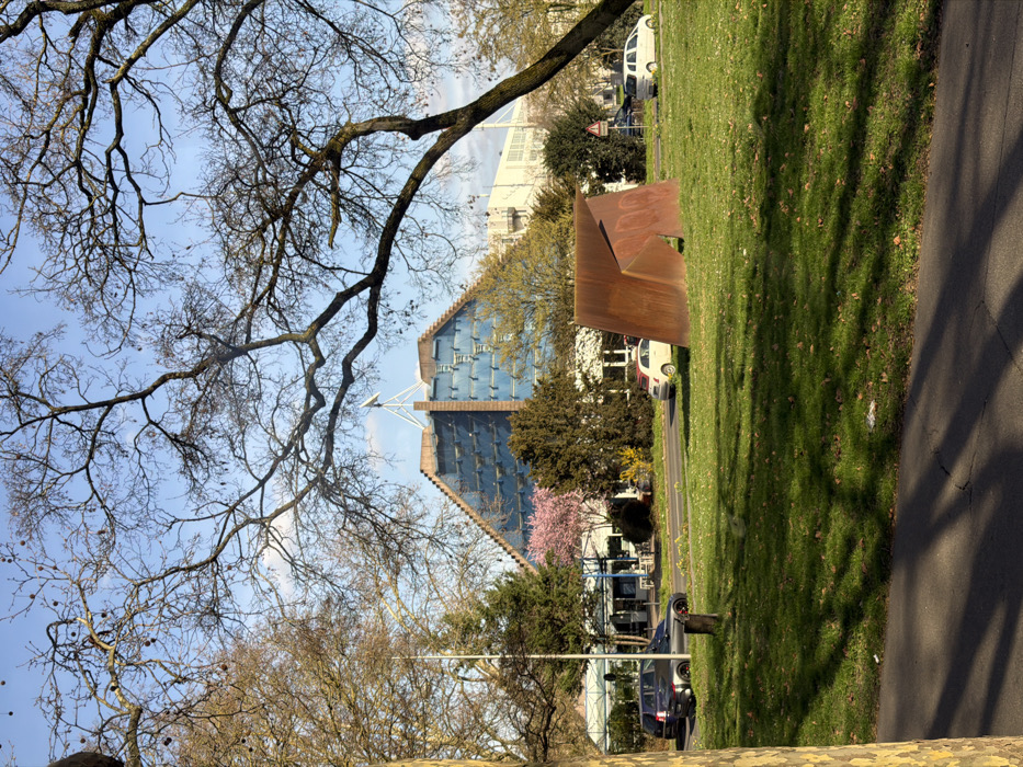 The image presents an outdoor scene in Mannheim, Germany, with the Technoseum (State Museum of Technology and Work) as a prominent background feature. The foreground consists of a green grass lawn, sparsely covered with brown leaves and marked by long shadows, indicating sunlight from the side. An asphalt path is visible along the bottom left edge. Positioned centrally on the lawn is a large, abstract sculpture made of rusted reddish-brown metal, characterized by angular, folded planes. In the midground, a two-lane road traverses the scene horizontally. A dark grey SUV and a dark grey sports car are parked on the left side of this road. On the right, a white Fiat 500 and another white compact car are parked. The road is lined with various trees and shrubs, notably a pink-blossoming tree and a yellow-flowering bush. A white triangular road sign is partially obscured on the right side of the road. The background is dominated by the Technoseum building, which features a distinctive steeply pitched, blue-paneled pyramidal roof structure with vertical brick-colored accents and a white antenna or weather vane at its peak. Behind this, another lighter-colored, multi-story building is partially visible. The sky is clear blue with minimal cloud cover. No individuals are present in the depicted scene.