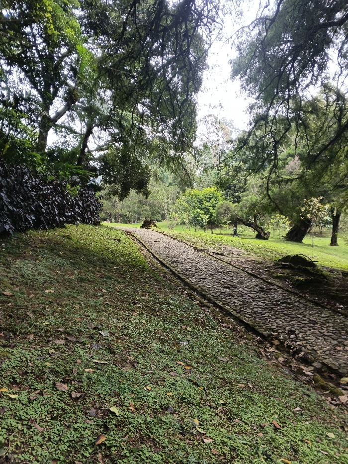 The image displays an outdoor park or garden setting within the city of Tây Ninh, Vietnam. A cobblestone path, constructed from irregularly shaped dark grey or brown stones, diagonally traverses the scene from the lower center-right foreground into the distant background, exhibiting a slight curve to the right before exiting the frame. The path features defined, raised dark borders. To the immediate left of the path, the terrain slopes upward, covered in dense green groundcover interspersed with scattered brown leaves. Further up this incline on the left, a substantial, dark green hedge or shrub mass is visible. The mid-ground and background are extensively vegetated with numerous trees, characterized by varying shades of green foliage. Many tree branches, particularly in the upper portion of the frame, are heavily covered with moss or epiphytic growth. Above, a light grey, overcast sky is visible through gaps in the dense tree canopy, providing diffused natural light across the scene, with some areas of dappled light on the grass. In the mid-ground, a low-profile, dark, rectangular stone structure or foundation is positioned to the left of the path. A single human figure, appearing as a small, indistinct dark silhouette, is observed walking away from the viewer in the mid-ground, situated to the right of the path amidst the grassy area and trees. No specific interactions are discernible.