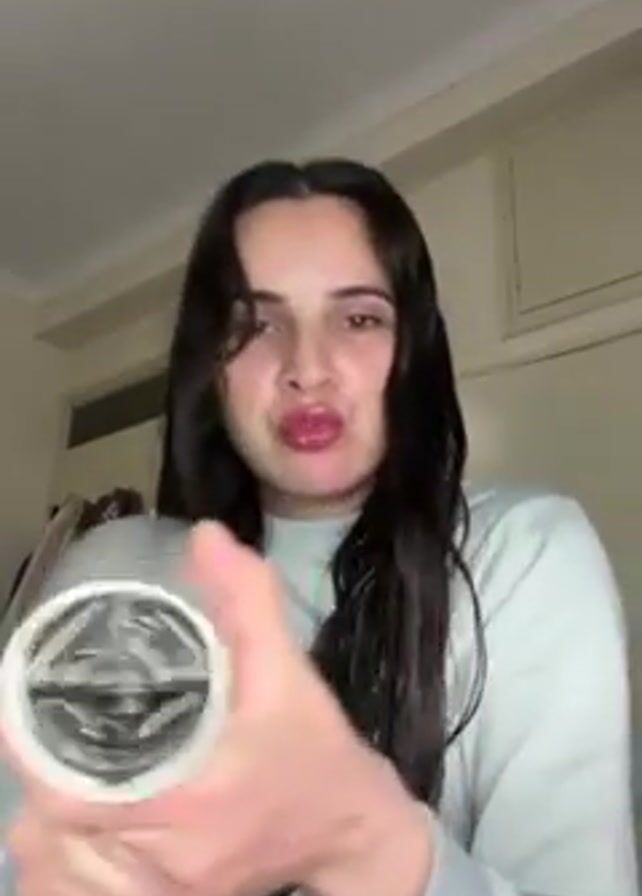 A young woman with long, wet, dark hair is holding a gray and purple hair dryer. She is wearing a light-colored long-sleeved shirt. She’s pulling the dryer apart, making exaggerated facial expressions. The background shows a white ceiling, a beige wall with a door and a light-colored cabinet, and clothes hanging.