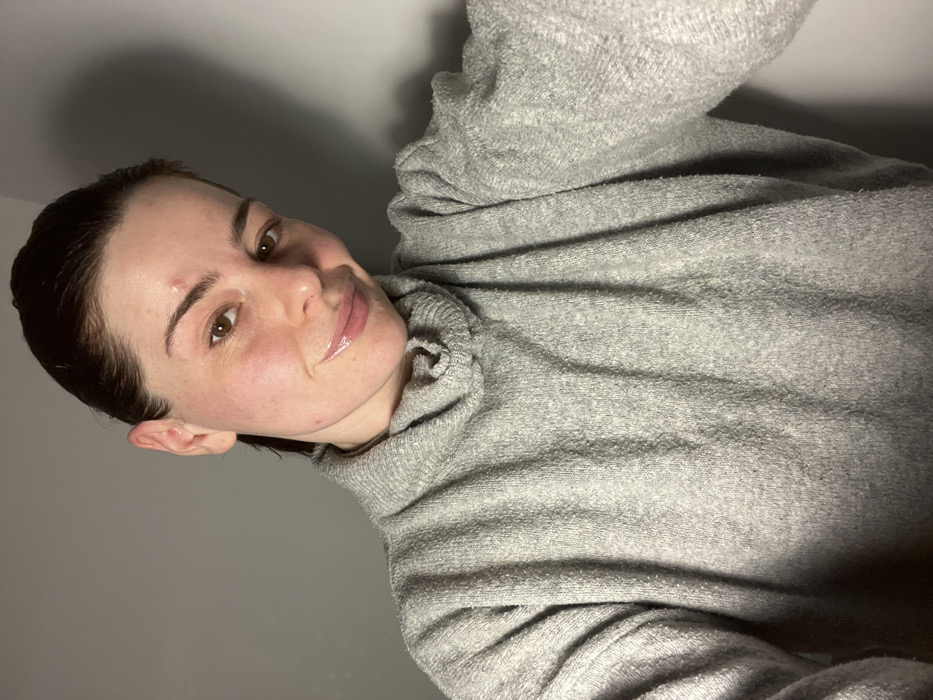 A woman poses for a selfie wearing a grey, high-necked sweatshirt. She has fair skin, brown eyes, and slicked-back dark hair. A small blemish is visible on her left eyebrow. Her lips appear glossy. She is facing the camera, angled slightly, with a relaxed, neutral expression. The background is a plain, light grey wall. The overall lighting is somewhat subdued, creating shadows on the wall behind her head.
