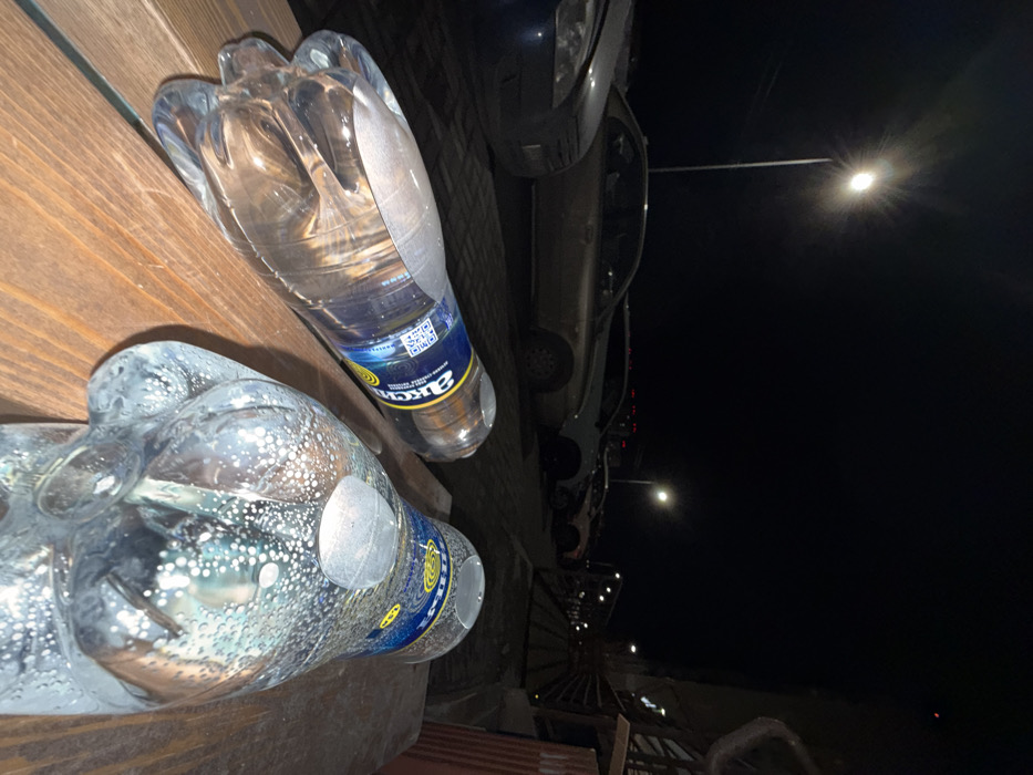The image depicts an outdoor, nighttime scene in Rostov-on-Don, Russia. In the foreground, two clear plastic bottles containing liquid are positioned on a wooden surface, likely a bench or table. The bottle on the left features a blue label displaying Cyrillic text "Акв" (Akva) and a QR code; it contains clear, still water. The bottle on the right has a blue and yellow label and contains clear liquid with numerous small bubbles clinging to its interior surfaces. Both bottles are capped. In the midground, a parking area is visible with several parked passenger vehicles, including a dark vehicle partially visible on the far left and a light-colored sedan in the center. The ground is paved, possibly with dark pavers or asphalt. The background is dark, illuminated by multiple streetlights. One prominent streetlight in the upper left exhibits a distinct starburst effect. On the far right, part of a structure with corrugated siding and indistinct features is visible. No individuals are present in the scene.
