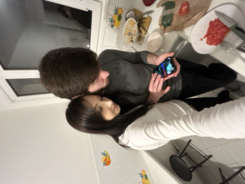 This image depicts two individuals in a kitchen located in Cachan, France. A female with long dark hair, wearing a white long-sleeved top and dark pants, stands on the left. Beside her, a male with dark, shaggy hair and a beard, wearing a grey Adidas long-sleeved shirt and dark pants, holds a black smartphone. Both individuals are looking down at the smartphone screen, which displays a colorful, intricate graphic interface. The male wears a thin gold-colored bracelet on his left wrist and a ring on his left ring finger. The kitchen features white walls and a white tiled backsplash decorated with colorful fruit decals, including oranges, bananas, and pineapples. A white-framed window is visible in the background, reflecting an interior space. The white countertop is cluttered with items, including a stack of dirty white plates with food remnants, a clear glass, a small white bowl, and cutlery resting on a wooden cutting board to the right of the individuals. Further to the right, a brown paper grocery bag with a distinctive green stripe contains what appears to be a tomato slice. In the lower right foreground, a white oval plate holds a pile of finely chopped red tomatoes, with a fork and knife beside it. A black metal folding stool is visible on the left side of the image, below the countertop. The floor appears to be a light-colored tile.
