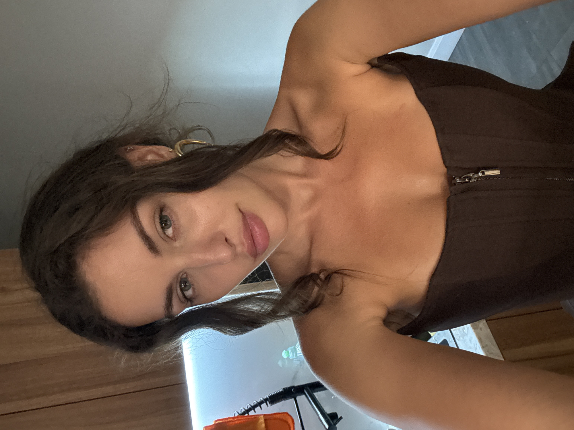 A woman with dark hair is looking into the camera. She has fair skin, green eyes, and pink lips. She wears a dark brown, strapless top that appears to have a zipper at the front. She wears a gold hoop earring. The background features a light grey wall, a glimpse of a room with grey floors, and a partially visible white object with orange accents. The location is unknown, and Kerobokan, Indonesia, cannot be confirmed.
