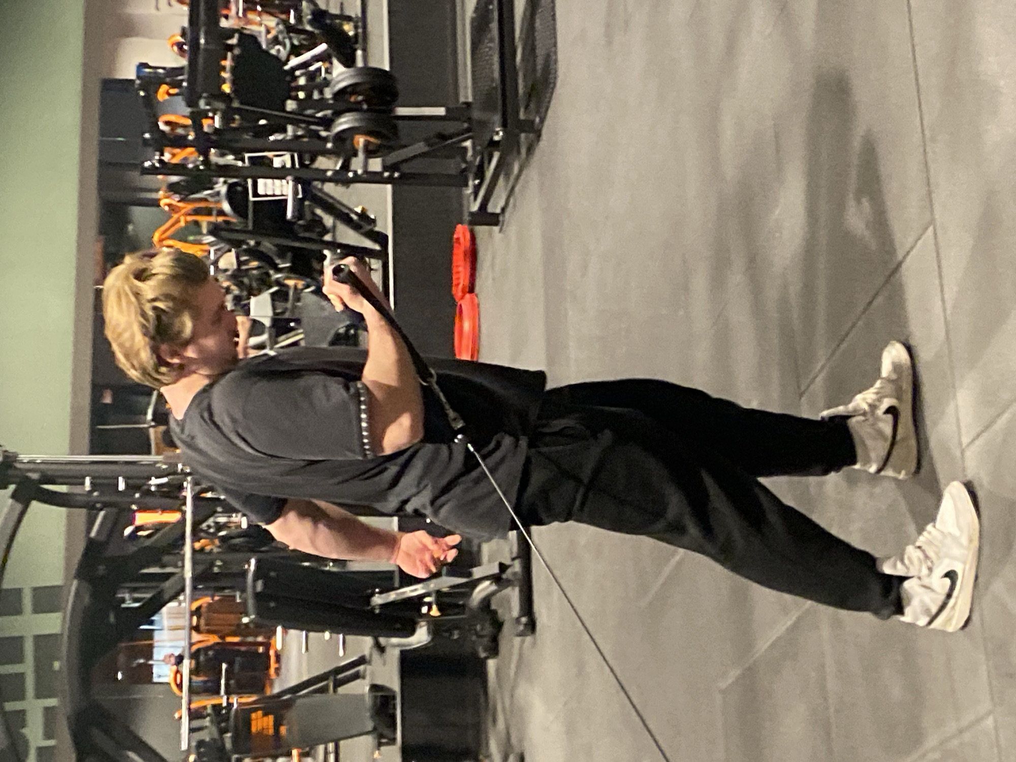 A person is using a cable machine at a gym in Hœnheim, France. The individual is wearing a black t-shirt and black pants with white sneakers. The gym contains various weight machines and equipment. The floor is gray tile.