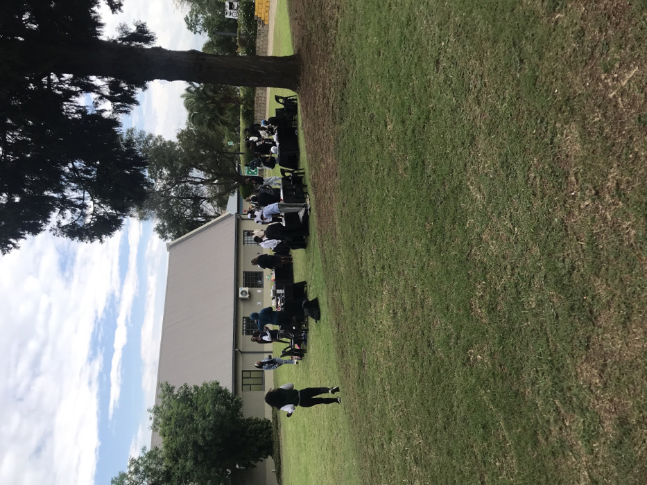 The image depicts an outdoor gathering on a grassy area in Midrand, South Africa, under a partly cloudy sky