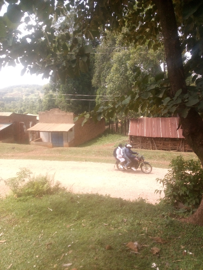 The image depicts an outdoor scene in Getenga ward, Kenya, featuring an unpaved dirt road traversed by three individuals on a motorcycle