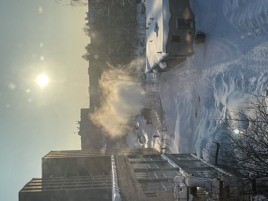 The image displays an urban winter scene in Nizhnekamsk, Russia, under a clear, bright sky with the sun positioned high in the frame. The entire landscape is covered in deep, sculpted snow. In the mid-ground, a significant plume of white and golden-hued steam or vapor emanates from a ground excavation, suggesting a utility line malfunction, likely a ruptured hot water pipe. Adjacent to this eruption is a yellow-orange backhoe or small excavator. Two individuals are visible near the backhoe, engaged in activity related to the steam source; their specific actions are obscured by distance and the vapor. A third, solitary individual walks on a cleared, snow-packed path leading away from the excavation area, towards the foreground-left. Several snow-covered vehicles are parked in an open lot behind the steam plume. To the left, a multi-story brick building, possibly an apartment block or administrative facility, occupies the foreground, its windows reflecting the sunlight and its ledges carrying snow deposits. To the right, a single-story brick building with a heavily snow-covered flat roof and several roof vents is partially visible. The background reveals additional multi-story urban buildings, some with visible rooftop antennae or structures. Bare trees and branches are present throughout the scene. The low sun casts long shadows and creates visible lens flares, illuminating the frozen environment and highlighting the steam plume. The presence of significant steam and snow indicates sub-freezing temperatures.