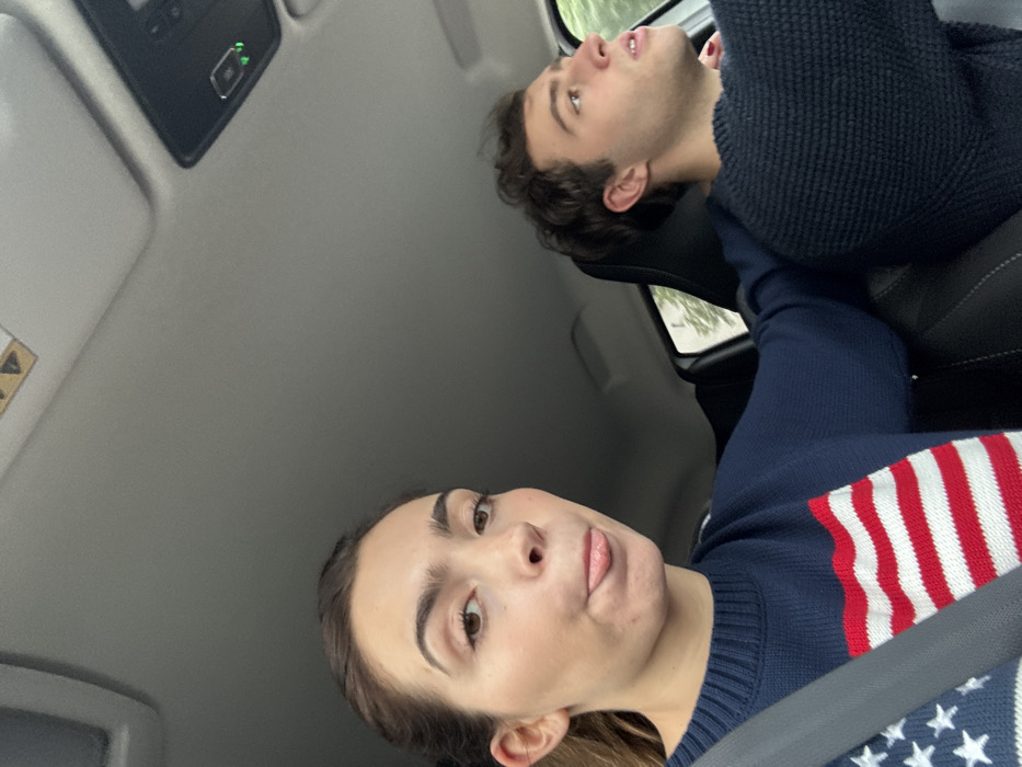 two young adults inside a vehicle. A female individual, positioned in the front passenger seat, is in the foreground, looking directly at the camera with her tongue slightly extended. She has light skin, brown hair, and is wearing a dark blue knitted sweater with an American flag pattern on the front. A gray seatbelt crosses her torso. Her right arm extends towards the driver. The male driver, positioned to her right and slightly behind, is partially visible from the chest up, looking forward and to his right, away from the camera. He has light skin, short brown curly hair, and is wearing a dark blue knitted sweater. The vehicle's interior roof lining is light gray, with an overhead console on the right featuring two illuminated green indicator lights. Blurred green vegetation and light-colored structures are visible through the vehicle windows, indicating an outdoor environment during daylight. There are no identifiable landmarks or unique features in the image to confirm a specific location within Matosinhos, Portugal.