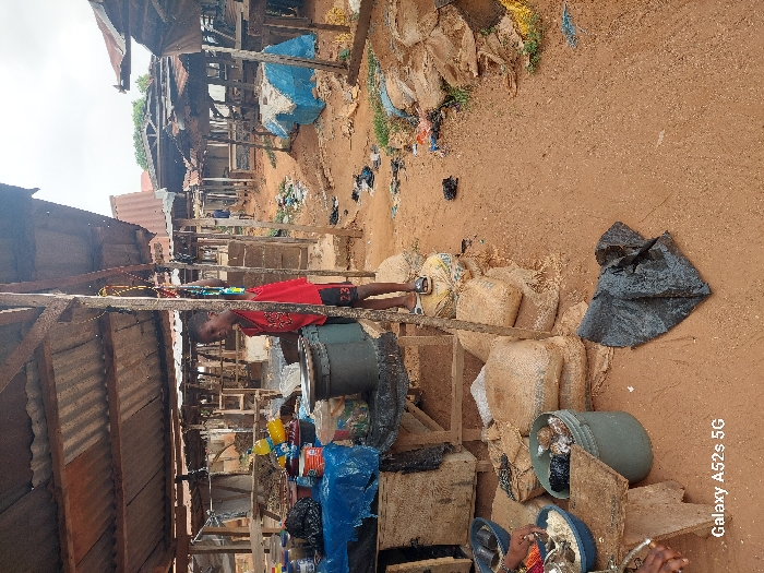 The image depicts an outdoor market scene in Awkuzu, Nigeria, under an overcast sky
