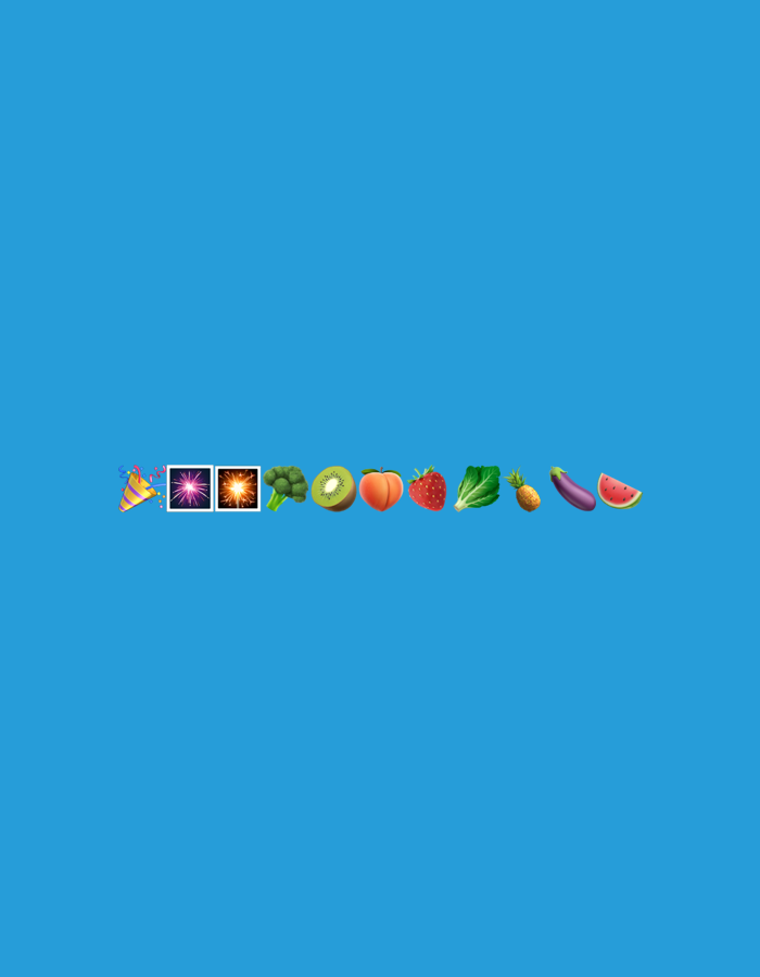 A line of emoji icons extends across the bottom third of a plain, blue background. From left to right, the emojis are a party popper, two fireworks, broccoli, kiwi, peach, strawberry, lettuce, pineapple, eggplant, and a watermelon slice. The emojis are vibrant and colorful, standing out against the uniform blue backdrop. They are evenly spaced, creating a visual rhythm.