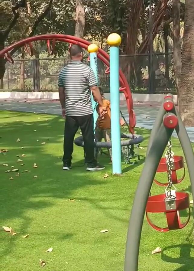 playground on a bright, sunny day. A man wearing a striped shirt and dark pants stands on a green artificial turf. He's facing away from the camera, watching a child, who's wearing a brown shirt and pants, play on a piece of playground equipment. The equipment has light blue poles, a red arched bar above, and yellow spheres on top of the poles. To the right in the foreground is a triangular swing set frame in gray, with two red bucket swings hanging from chains. There are bare trees visible in the background behind a dark fence. Scattered brown leaves are visible on the green turf.