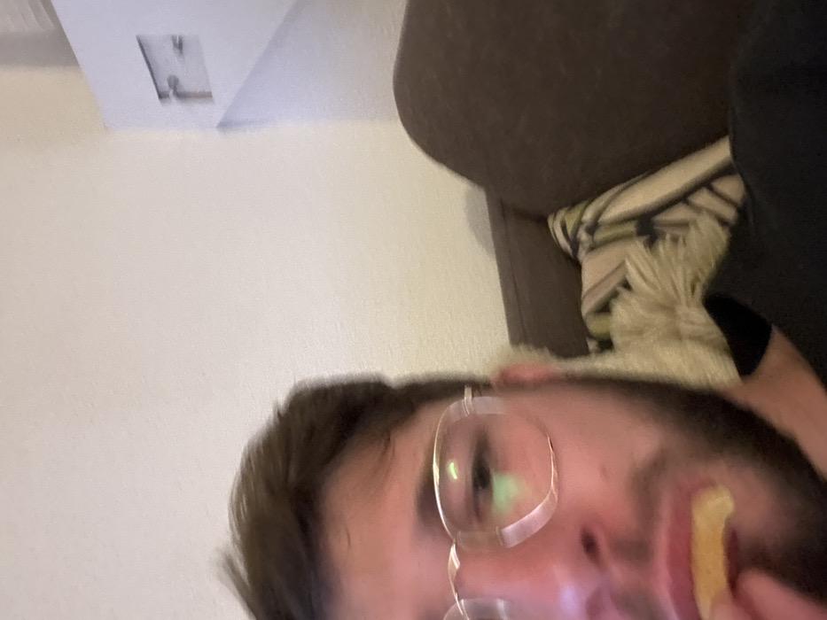 An image taken in Sélestat, France, depicts a close-up, partial view of an individual indoors. The subject is a male with dark hair, a beard, and wearing gold-rimmed eyeglasses that show a green reflection. A piece of yellowish food, possibly a chip, is partially visible in his open mouth, indicating he is eating. To the right of the subject, a dark brown upholstered couch armrest or backrest is present, with a patterned cushion featuring geometric shapes and a textured detail. The background consists of a plain, light-colored, textured wall. In the upper right corner, a white angular structure, possibly part of an interior staircase or architectural recess, is visible.