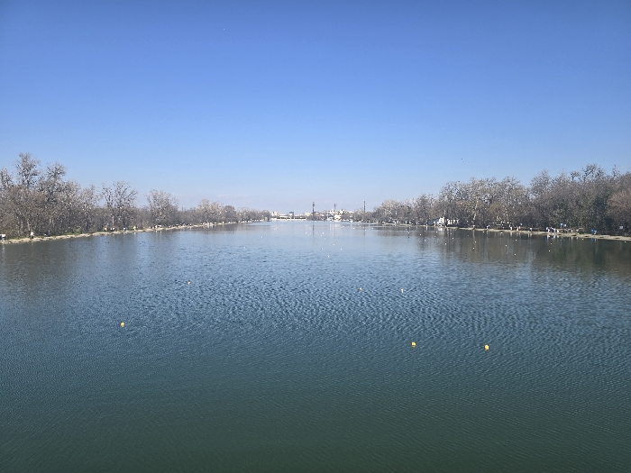 A panoramic view depicts the Regatta Venue, also known as the Rowing Canal (Grebna Baza), in Plovdiv, Bulgaria