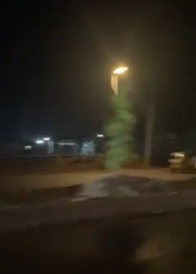 The video appears to be a low-quality, slightly blurry shot of a road at night, likely taken from a moving vehicle