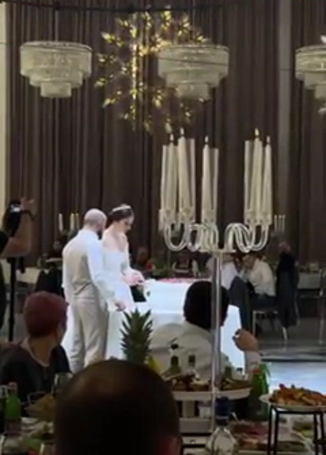 A well-lit, medium-angle shot captures a wedding reception, where a bride and groom are cutting the cake. The bride, in a white dress and tiara, stands beside the groom, who is clad in a white suit. They jointly hold a knife over a white cake adorned with red strawberries on top. Attendees sit around tables laden with food, including a visible pineapple. Two chandeliers hang from the ceiling and a photographer stands to the left, capturing the moment. Brown curtains serve as a backdrop.