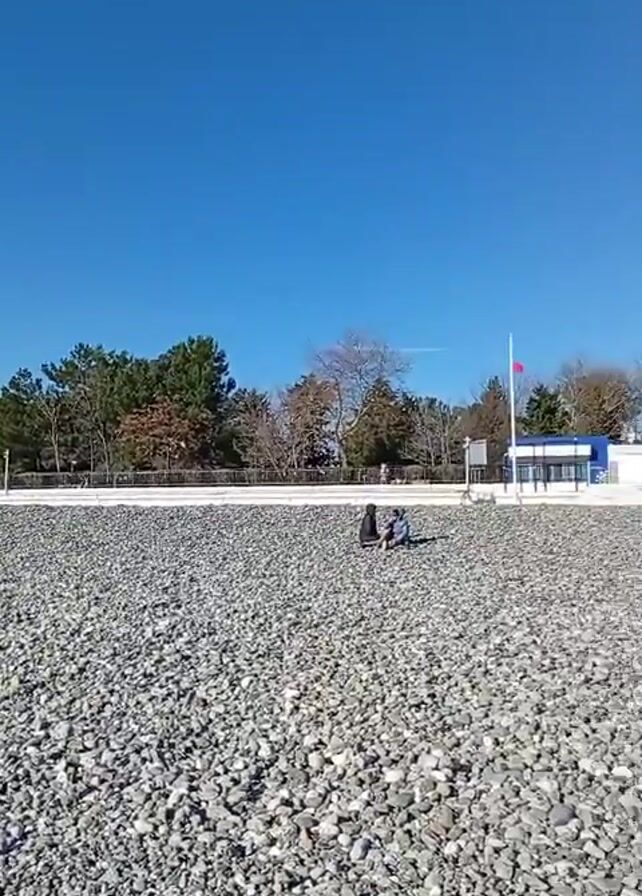 The video pans across a sunny, pebble beach towards the sea. A blue building and red flag are visible near the trees at the edge of the beach. Several people sit, stand, and walk along the beach. In the distance, mountains with snow-capped peaks are visible.
