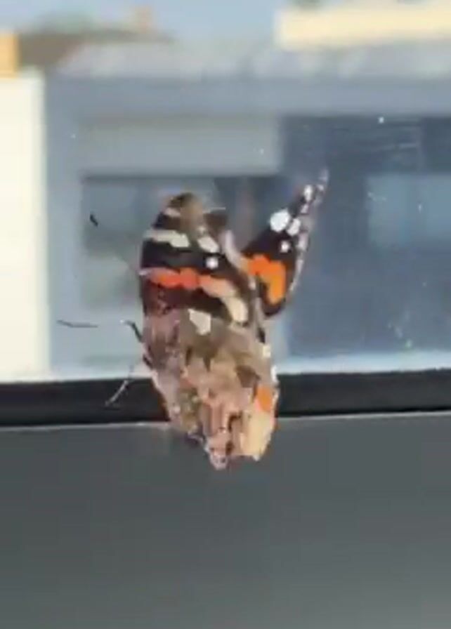 butterfly with dark wings marked by orange and white spots, resting on the inside ledge of a window. The butterfly's wings are slightly tattered. Through the window, a blurred view of a white building with multiple windows can be seen. The video is taken at a close range.