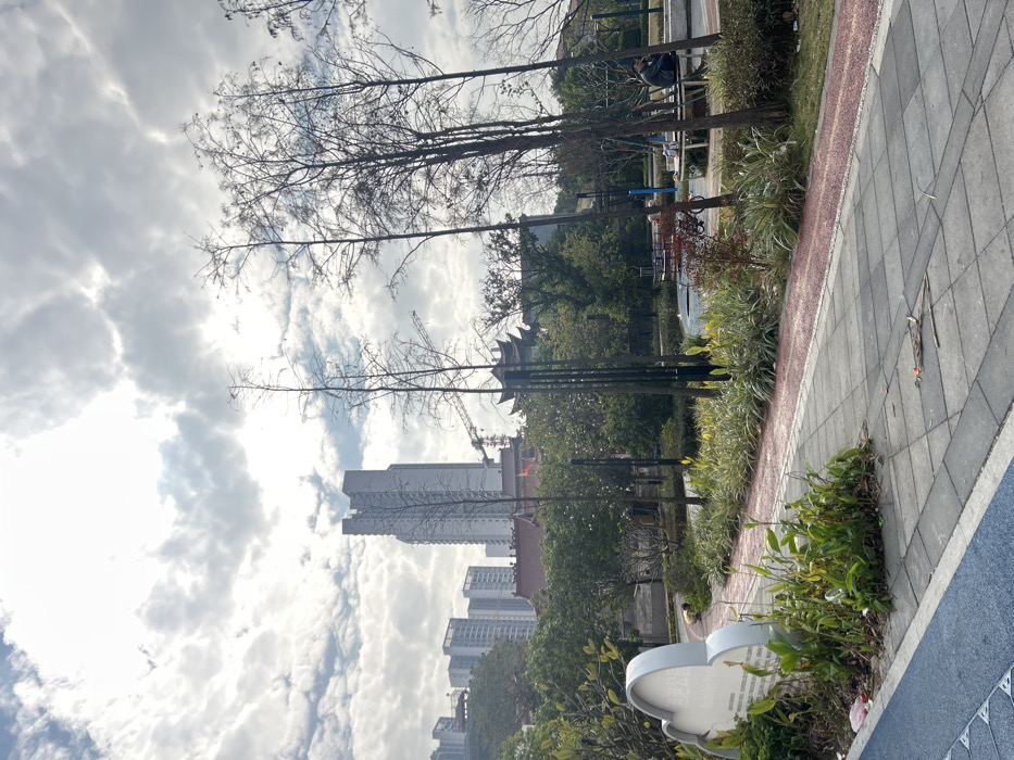 A cityscape blends nature and architecture. Bare trees line a paved path beside lush greenery. Buildings rise in the distance under a cloudy sky, a construction crane visible. The path transitions to a blue surface. A person sits near the trees, observing the scene. A sign stands near the foreground, adding a personal touch to the outdoor space.