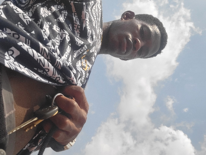 An outdoor, low-angle, head-and-torso shot depicts a dark-skinned male adult positioned against a clear blue sky with scattered white cumulus clouds, located in the city of Nwofia, Nigeria. The individual looks directly towards the camera with a neutral expression. He wears a dark short-sleeved shirt with a repeating pattern of white text. His right hand, visible in the lower right portion of the frame, holds a set of keys. The keys include at least two metallic keys and a black plastic key fob, all attached to a silver-colored key ring and a dark lanyard. A metallic watch band is present on his right wrist.