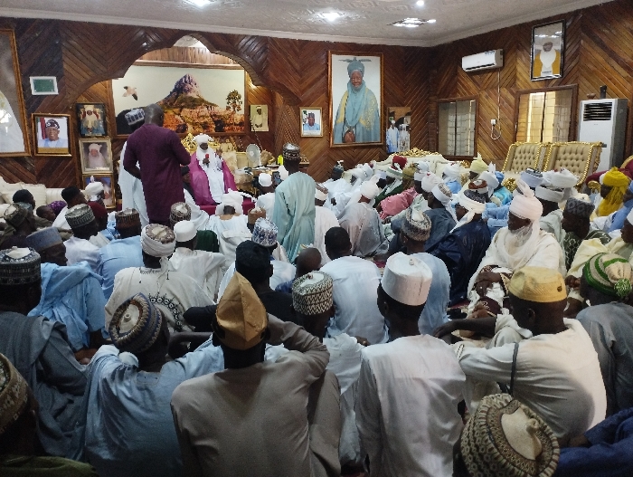 large gathering of men in a meeting room in the town of Kaltungo, Nigeria. The room is decorated with wood paneling and pictures on the walls, and there is a large, ornate, wooden door leading to another room. Most of the men are seated on the floor, wearing white and blue robes and various forms of headwear. There is one man standing and speaking. The men are attentively listening and engaging in the discussion. The man speaking is standing near another man wearing a pink robe, and they appear to be in the middle of a conversation. There are also several framed portraits on the walls, showing prominent figures in the community. There is a large air conditioning unit hanging on the wall. The room is dimly lit. The men in the image are likely participating in a religious or community gathering. The meeting is taking place in a room that is well-appointed, indicating that the event is important to the participants.