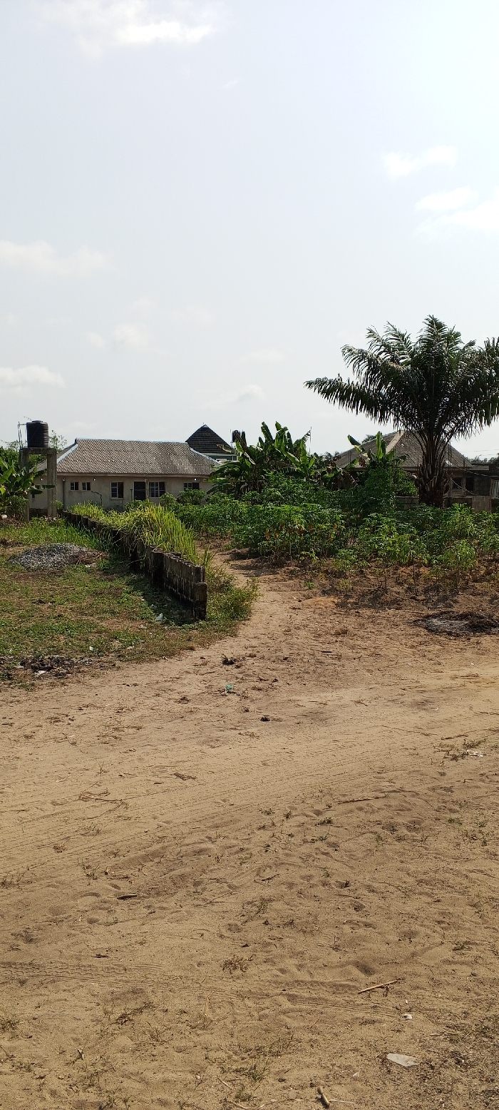 The image displays an outdoor scene in the city of Ijotan, Nigeria, under a bright, cloudy sky. The foreground consists of an unpaved, light brown sandy area showing distinct tire tracks and scattered minor debris, interspersed with sparse patches of green vegetation. A low, grey concrete block wall runs diagonally from the left, demarcating the sandy area from a strip of taller green grass and a small pile of gravel to its immediate left. The midground is characterized by dense green vegetation, including several large-leafed plants consistent with banana trees, and numerous smaller, leafy plants. A narrow dirt path continues from the sandy foreground through this vegetation. A tall palm tree with dark green fronds stands prominently on the right side, partially obscuring a building. In the background, several structures are visible. On the left, a single-story building with a light-colored, possibly tiled or corrugated roof and multiple windows is present. To its left, a black water storage tank is elevated on a stand. Further right, a building with a distinctive dark, possibly conical or pyramid-shaped roof is partially visible behind the vegetation. Another building with a lighter roof is partially obscured by the large palm tree on the right. No individuals are present in the scene.