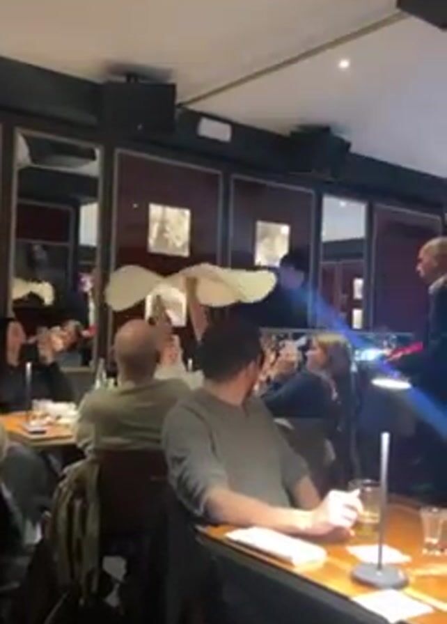 n indoor restaurant scene. The restaurant is fairly busy, with people seated at tables and along a bar. A man in a suit stands in the middle of the room, holding a large round piece of what appears to be pizza dough. He twirls the dough above his head while another man films him with a phone. Patrons seated at the tables are filming the scene with their cell phones. A spotlight shines on the pizza dough being twirled. The decor of the restaurant consists of dark wood, mirrors, and framed black and white photos. There is music playing in the background.