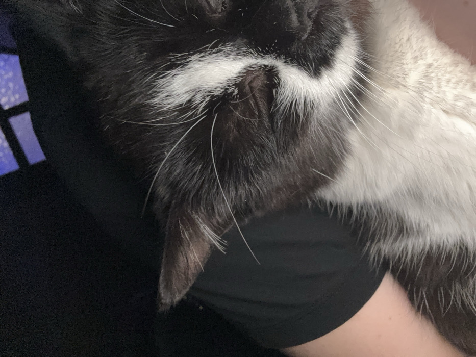 A close-up shows a black and white cat, likely napping, against a dark-clad person. The cat's face is partially visible, showing its fur, ear, and whiskers. The black fur is mostly visible, but the ear has hints of brown to it. A patch of white fur is noticeable above the cat's eye. The person's arm and upper chest are visible, covered by a black shirt. A blurry window is in the background.