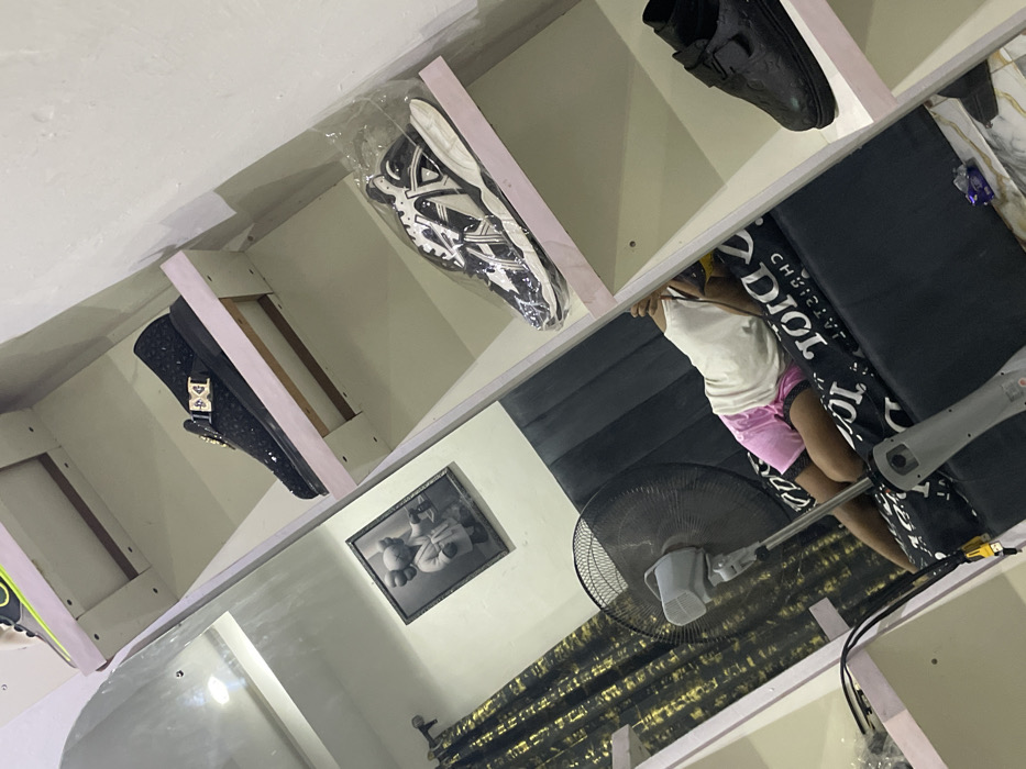A tilted shot shows a reflection in a mirror, revealing a room. A shelf holds shoes, including black loafers, sneakers in plastic, and black flats. The reflection captures a child in a white shirt and pink shorts, seated by a fan. Behind the fan are black curtains with gold accents. A framed picture hangs on the wall in the reflection.